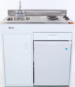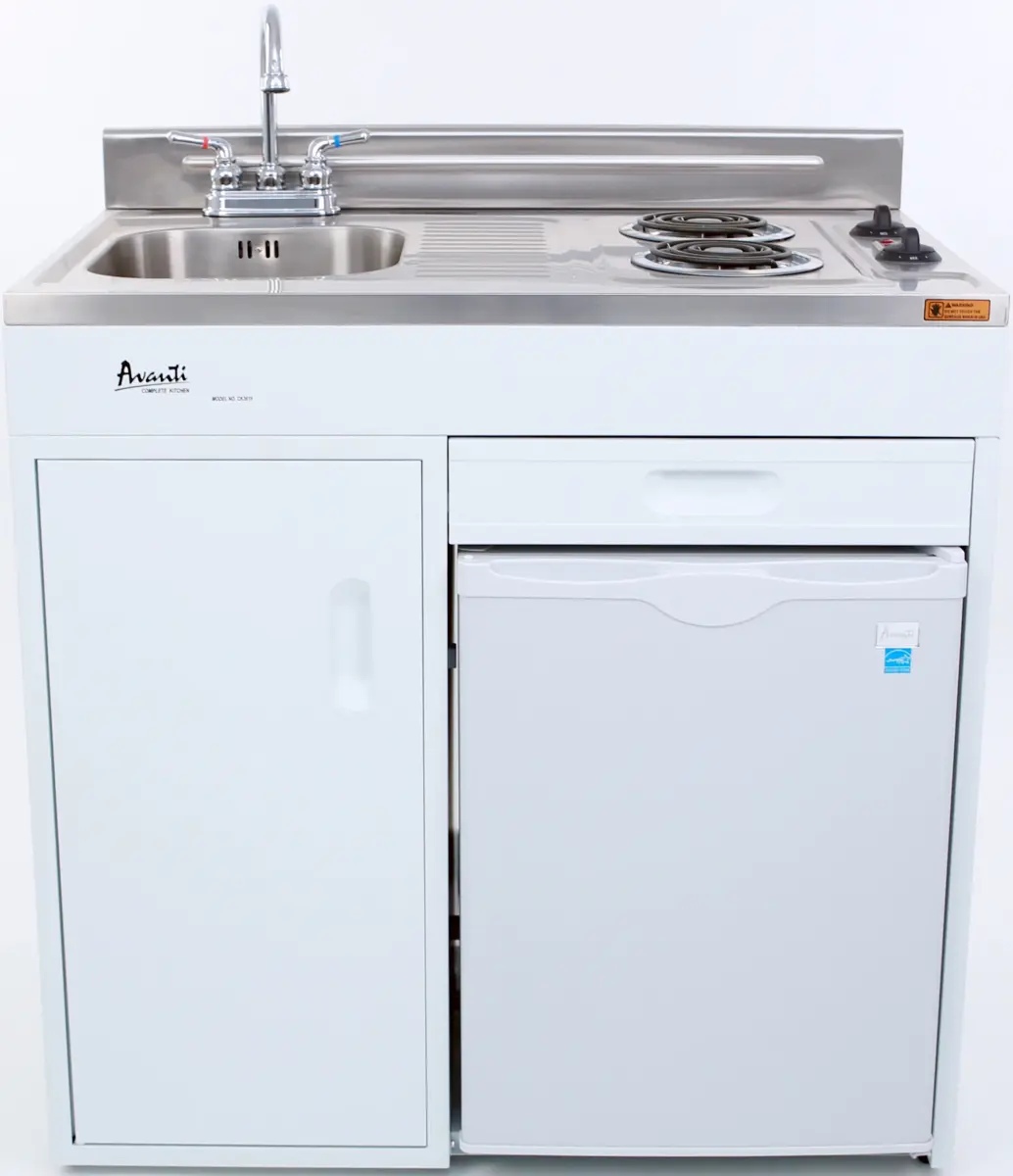 Solve small kitchen space problems with the 36" compact kitchen from Avanti. This all-in-one kitchenette with stainless-steel countertop, backsplash, and sink, two-element electric coil cooking range, built-in, refrigerator, and separate storage drawer and cabinet.Read More