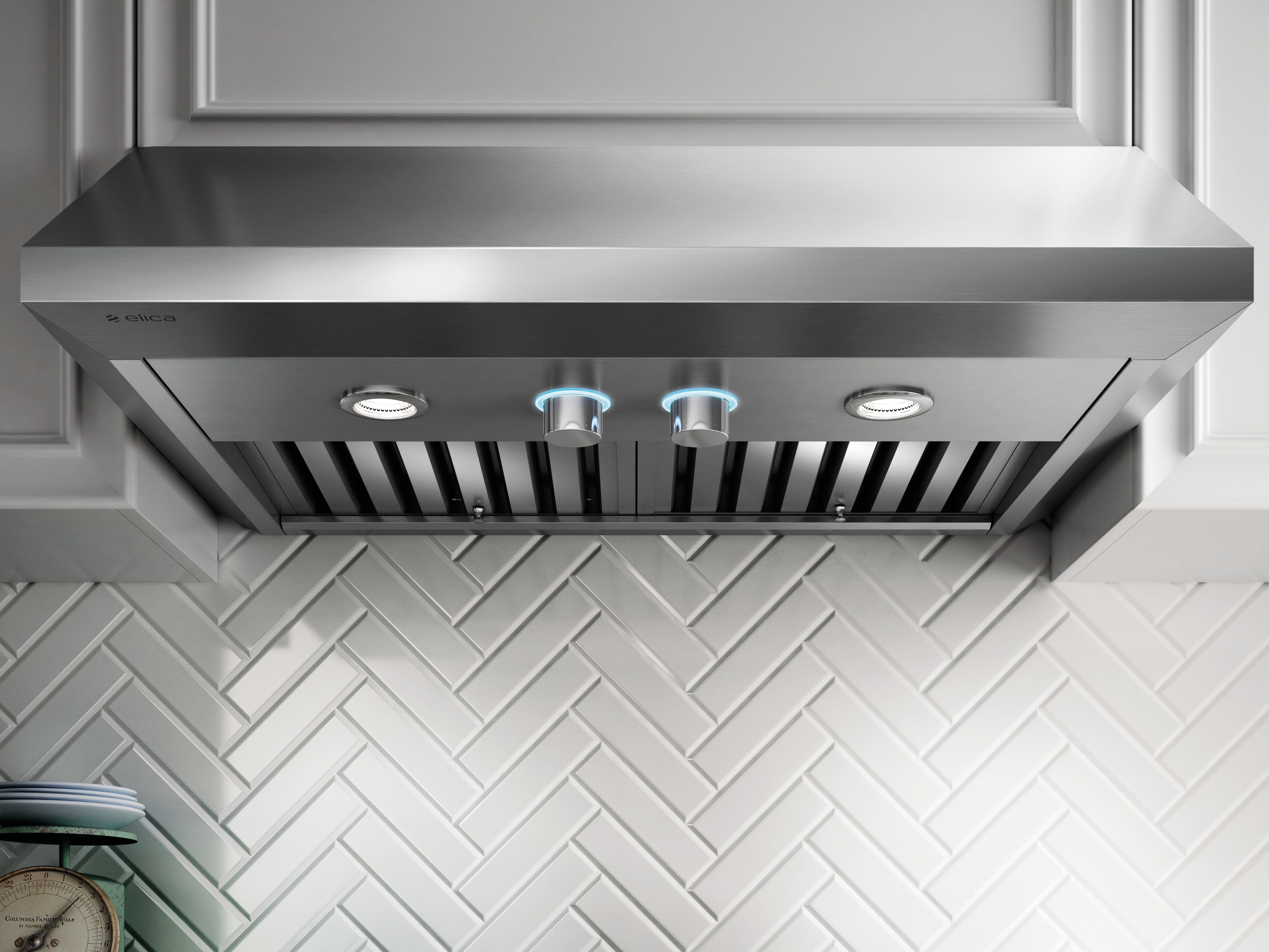 This hood features professional styling, seamless welded corner craftsmanship, a powerful 600 CFM blower with high airflow, heavy duty stainless steel baffle grease filters, replaceable LED lighting, plus stainless rotating knob controls for convenience and safety.